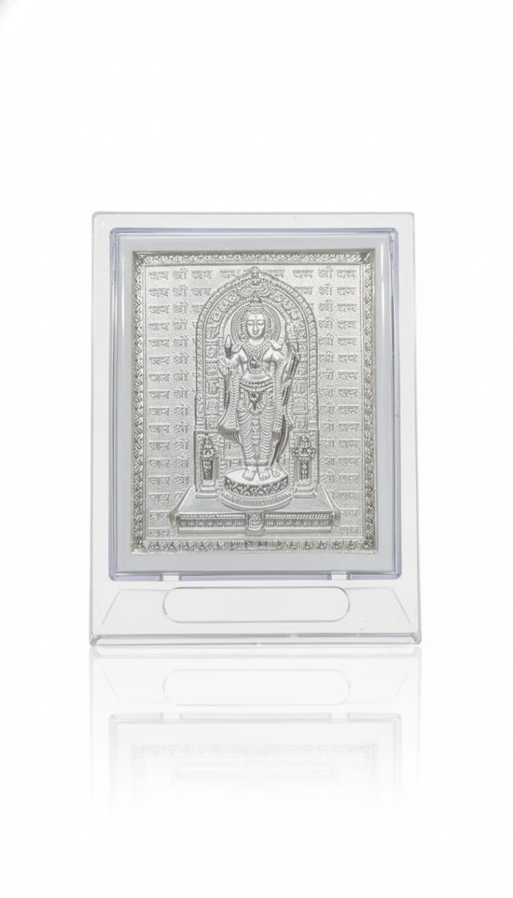 The 999 Silver Shri Ram lalla Economic Photo Frame (3.5 x 4.5 inch) features a high-quality 999 pure silver embossed Ganesh image, protected with a clear acrylic front and a wooden finish frame. Designed as an affordable yet premium-looking devotional frame, it is perfect for gifts, home décor, offices, pooja rooms, and return gifts.